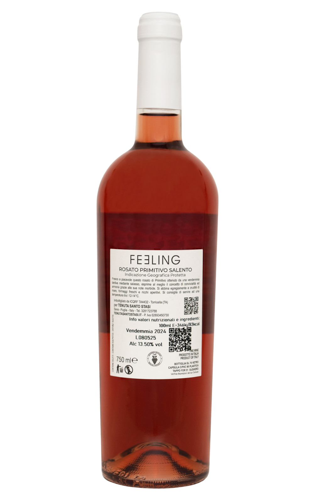 In conclusione, Feeling Rosato Primitivo Salento IGP 2024 è un rosato elegante, fresco e territoriale, pensato per chi cerca un vino versatile, autentico e capace di raccontare il Salento con semplicità e stile. Un’espressione moderna del Primitivo, ideale per accompagnare momenti conviviali e una cucina leggera ma ricca di sapore.